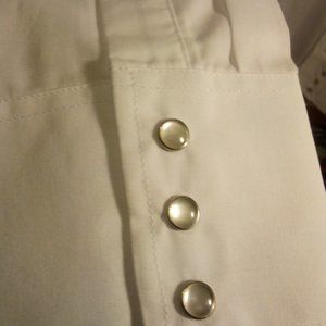 2) SHEPLERS DRESS SHIRT WHITE SZ 17 1/2 X 35 -This 90's vintage shirt looks new (see tag) so I probably wore it once. It's too dressy for me. It reminds me of my early school uniform days. 2 pearl snap breast pockets and 4 snap cuffs. Made in China of 85% poly and 35% cotton.Machine wash warm, tumble low, do not bleach and iron as needed. (Sheplers no longer makes their own brand shirts).