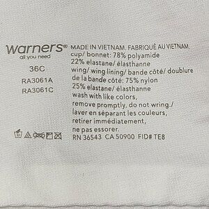 The product is a Warners white T-shirt bra in size 36C, featuring a hook & eye closure, lightly padded cups, and a smoothing accent. Made from a nylon blend material, this underwired bra is designed for comfort and support. It is a classic style bra with a solid color and bra strap straps, perfect for all seasons. The bra is part of the Warners product line and is recommended for hand wash care.