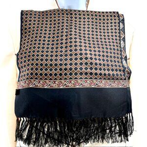 This is 2 ways vintage charming desinged brand scarf style reversable high quality 100% silk satin Burberrys scarf features a classic brown and black Burgendy check paisley art pattern with fringesed, giving it a sophisticated and luxurious look. Measuring 60 inches in length and 13 inches in width, this versatile piece can be worn as a neck warmer or in various other ways.