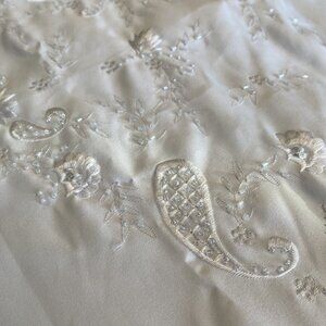The sweeping elegance of this dress echoes of Royal Princesses and Fairy Tale weddings. Both modest and beautiful, this dress is sure to stun him as you walk down the aisle! This is an heirloom quality wedding gown. Please be prepared to pay in cash when you come to try on the dresses.