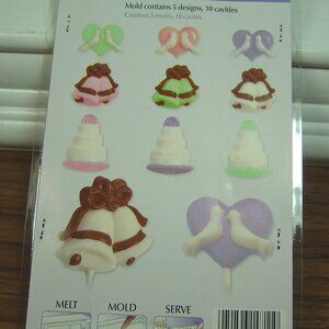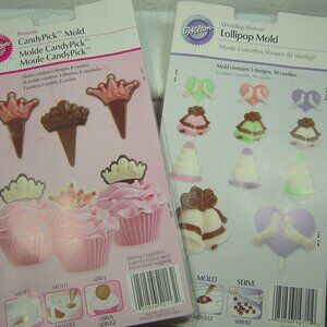 This listing is for a Wilton Candy Pick Mold set--Princess designs--2 designs, 8 cavities. The other is a lollipop mold with a wedding shower theme-5 designs, 10 cavities. Both sets are new in package.