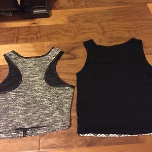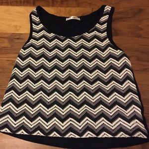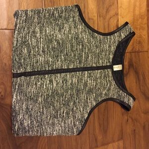 2 black/grey/white crop tops, one fitted (chevron pattern with black back), the other a little more flowy (grey knit material top w/ leather piping on top). Both size Small but fitted might be more for XS! Barely worn w/ no rips or stains.