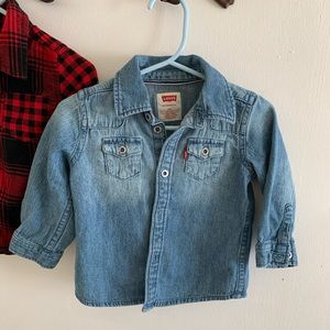 One Baby Gap red and black buffalo check button down and one Levi’s denim button down. Both in EUC
