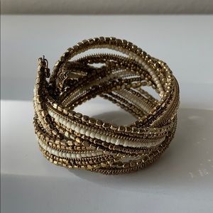 Set of beaded bracelets - left is gold and white, right is gold with shades of brown