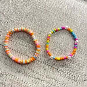 Two pairs of bracelets clay beads and dead beads colors are white pink orange and blue and yellow! 7inches very comfortable