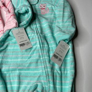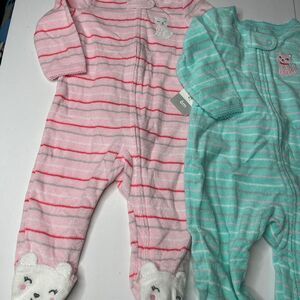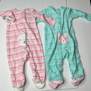 2 pack bundle carters terry cloth zip up one piece footie footed pajamas Pink and green striped cat & bear (?)