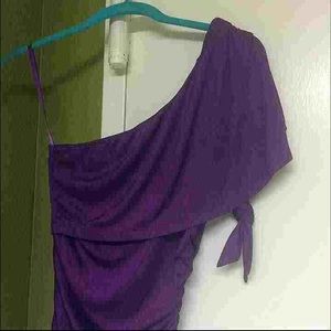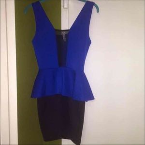 Blue and black peplum dress with see through netting down middle of back and chest. Strapless purple one shoulder cocktail dress. Blue dress is a size small and NEVER WORN. NEW WITHOUT TAGS‼️ Purple dress is a size medium but fits like a small, worn but in Mint condition. MUST GO ‼️‼️