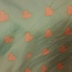 1) teal with cream hearts, long, and silky. Soft material