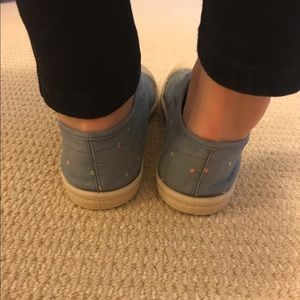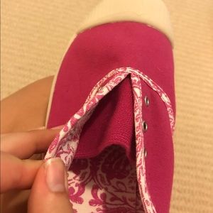 Pink slide sneakers with cute, white and pink printed piping and light blue with green and pink polka dots. White rubber soles with toe. Size 5. TWO FOR ONE. Pink ones are in great condition, blue worn more. Velcro across top of foot gives good stretch and comfort.