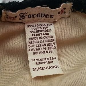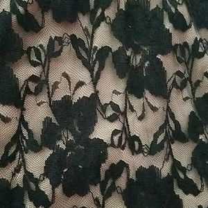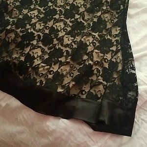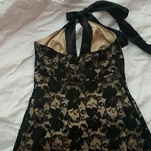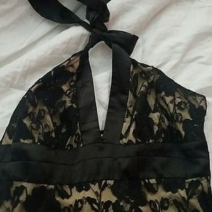 Tan Silk with Black Lace Overlay and Black Silk Trim at the hem and waist. Low cut halter top that ties around the neck.