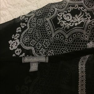 Charlotte Russe XS Bundle, One is a black and white cold shoulder top with banded spaghetti straps and banded sleeves and bottom, The other is a black, white, and pink dolman top with scoop neck and banded bottom