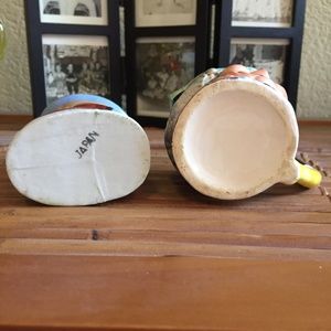 Two cute little vintage hand painted Toby mugs for the Toby collector. The tall full body one looks like a colonial American man (I think). Looks like a bit of brown paint for the jacket dripped on the handle. It is stamped "Japan" on the bottom. About 3-3/8" tall and 2-1/2" long. The shorter 'head' one is lighter in feel, like a finer porcelain. No stamp on the bottom. About 2-5/8" tall and 2-1/8" wide. Both are in very good vintage condition. No chips or cracks.