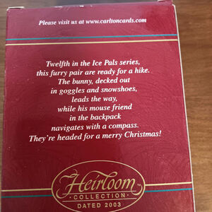 This ornament is in excellent condition. It is a bunny dressed in googles with snowshoes on and standing on an ice cube. The bunny is standing on an ice cube with the year 2003 stamped on it. This ornament is the 12th in the Ice Pals series.