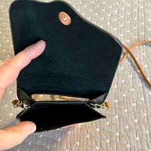 Chic crossbody bag with multicolor stripes. Features a sleek tan flap and strap. Fits most cellphones. Can text and scroll while in pouch. 1 pocket. Brand New! Strap is approx 24 in. Measures approx 4in x 6 in