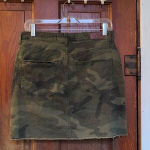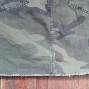 Green camouflage high waisted mini-skirt with frayed hem. 2 front pockets (plus change pocket), 2 back patch pockets, 5 belt loops, zipper and metal logo button closure.