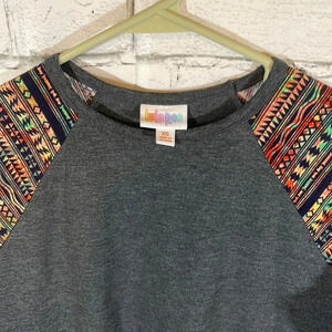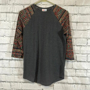 Lularoe. Randy top. Super soft. Long slightly fitted. 3/4 length sleeves. Gray body. Multi-color Aztec print sleeves. See size chart for sizing. Excellent condition. Size XS.