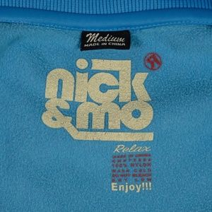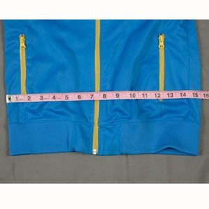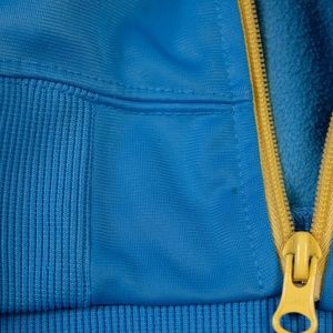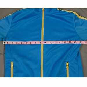 Super cute medium blue track jacket with pale yellow, cream and green stripes down sleeves.