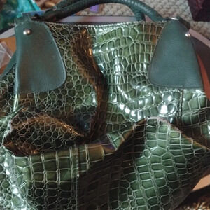 essence of Beauty green 14"x15" green bag used, button closure metal loop leather handles