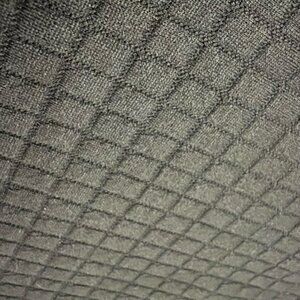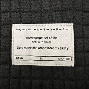 Relaxed fit, solid black with a waffle square pattern. White tag on the left front with a poetic phrase.