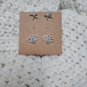 Charming womens earrings set featuring silver starfish and turquoise flower designs. Perfect for adding a touch of whimsy to any outfit.