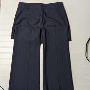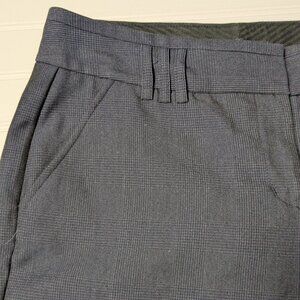 dress pants, trousers, slacks, navy, midnight blue, dark blue, subtle plaid, check pattern, woven fabric, tailored material, structured feel, flat front, straight leg, fitted waist, professional style, office wear, business attire,