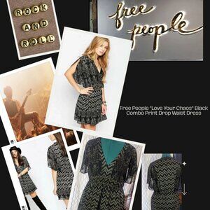 **Item:** Free People “Love Your Chaos” black combo mini dress with a dynamic tribal zigzag and geo print. Features a deep V neckline, sheer flutter sleeves, and flattering drop waist silhouette. Light and breezy with a subtle edgy-rock chic vibe—perfect for layering with boots or dressing up for night-out flair.