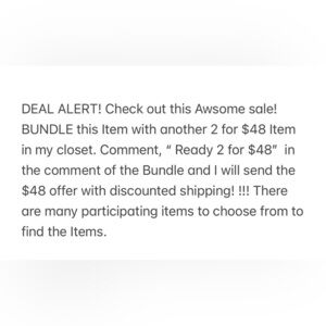 DEAL ALERT! Check out this Awsome sale! BUNDLE this Item with another 2 for $48 Item in my closet. Comment, “ Ready 2 for $48” in the comment of the Bundle and I will send the $48 offer with discounted shipping! !!! There are many participating items to choose from to find the Items.