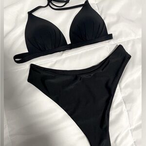 Sexy black swimwear set perfect for a stylish beach day. Brand new and never been used. Black closure is a metallic clip for the back and strings for the top (neck) part. The bra has built in cups that are not removable and can fit a size A cup, maybe a B cup will have some spillage.