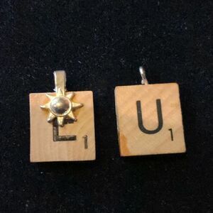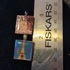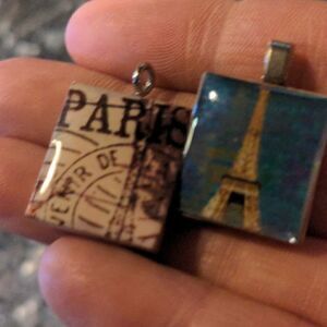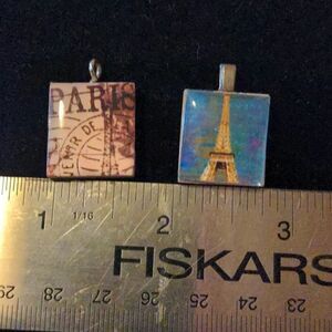 Aimez-vous Paris? Show off your love of Paris with this cute pair of Scrabble tile pendants. One has the Eiffel Tower and the other looks like a stamp. Like new.