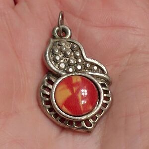 Funky studded matte silver pendant with bright splotchy red and yellow centerpiece. No brand markings. Measures about .75" wide, 1.25" high. Good condition.