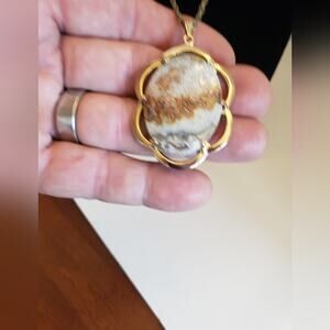 1 is a copper chain with a beautiful stone in a gold tone framing it 2 is a gold tone chain with an ornate oriental theme pendant also.having a stone.