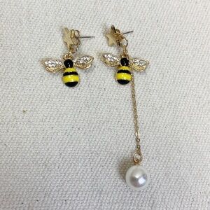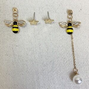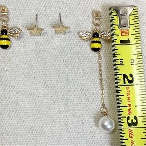 Gold tone star stud earrings with enameled bee enhancer dangles on the earring pushbacks - one earring also has a gold chain with faux Pearl dangle - can be worn as stars alone, with the bees or with the bees and faux Pearl - like new condition