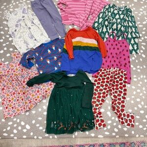 Includes 1 pajamas striped pink set, frozen disney elsa princess nightgown dress, 2 leggings: purple & strawberry 4 dresses: reindeer tulle long sleeve, Christmas tree, floral peachy pink, striped “rainbow” orange blue yellow colorblock. Strawberries pink & red romper dress look with built in shorts. Miffy bunny crewneck sweatshirt sweater