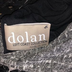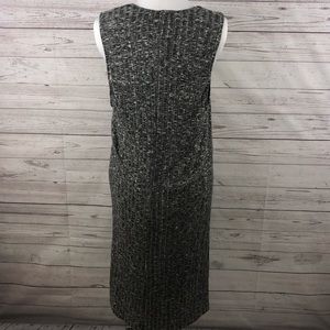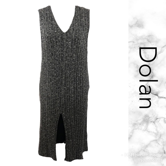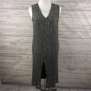 Guc. 2 layers, top layer is heathered grey, bottom layer is black. Approximate measurements laying flat: chest 16, top layer length from shoulder to hem 43, bottom layer from shoulder to hem 36, slit in front from hem to end of slit 16.