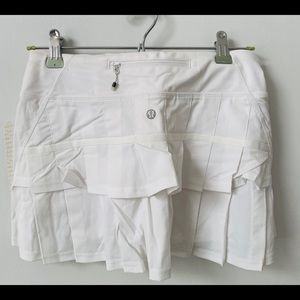 Lululemon tennis skirt. The spandex shorts have a rubber rim on the leg so they don’t ride up. Flattering ruffles on the back and a sleek look in the front. Black doesn’t have tags but has never been worn. The white skirt has. A discoloration on the hip area but has Tags and never worn. Both were $58 and are a size 4
