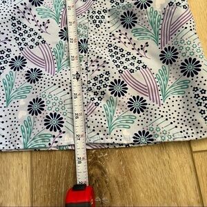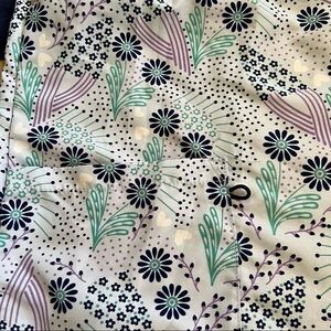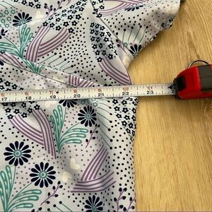 2 pairs of medical scrub tops, XL, dark blue animal print Jockey, white purple blue and green floral print with hearts mock wrap Serene Uniforms, pockets, V necks.