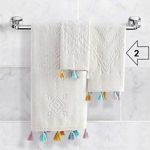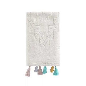 2 brand new Wild Sage™ Gloria Geo 16x26-inch 100% Cotton Hand Towel with colorful Tassels. NOTE: The manufacturer's name for the color is White .... however, in real life, it looks like a Creamy Beige. Machine washable. Condition is brand new with original retail tags ... UPC 042075610883.