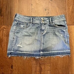 Jeans skirt has pockets on front & back, double button/zip closure, small slits on side, 16 1/2” across waist laying flat,