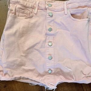 Pink skirt has metal buttons down front, cotton/spandex, pockets on front & back, 16” across waist laying flat, 16 1/2”L waist to bottom of hem
