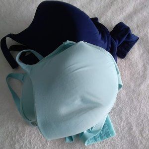 Pretty combo of blue colors: dark navy blue and light sky blue. I bought 2 of these 3 packs. I tried one from this pack and did not fit me correctly. I kept that bra but selling these 2 from the bundle. These have not been worn but were laundered before I knew did not have the perfect fit. Lightly padded, underwire, 3 prong hook in the back. Adjustable straps. I love different color bras.