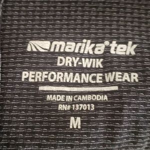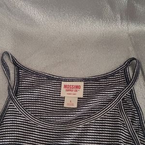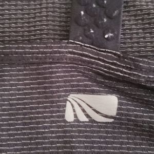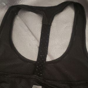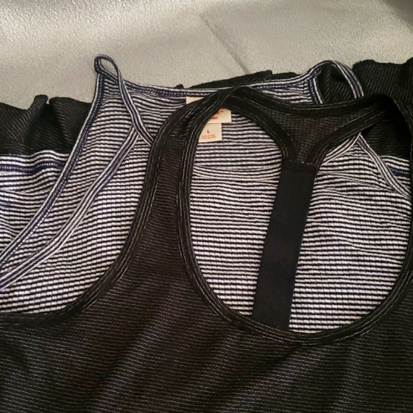 2 tanks. Spagehti strap black and white and racerback black. One is marked Size L, its smaller like a medium. Black one is light weight drywicking material. Both have ruffle hem. Cute and sporty.