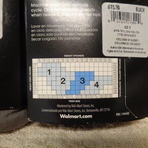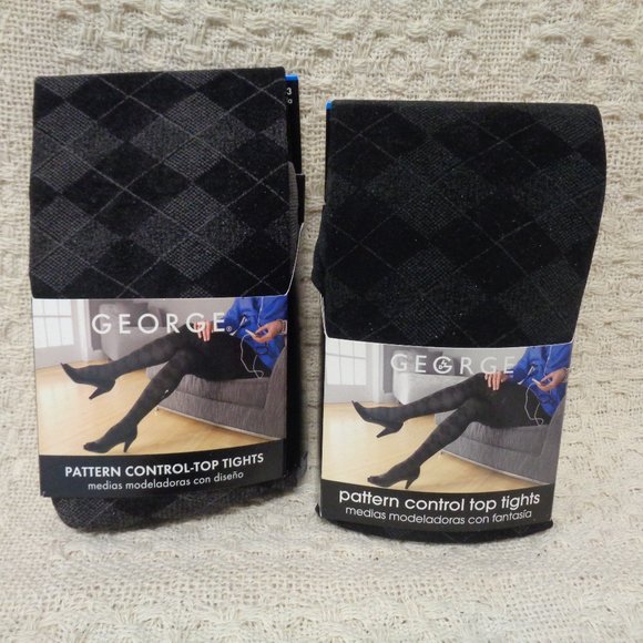 Two pair of size 3 ( please study size chart in photo 3) George Pattern tights with control top. One pair is in grey pewter and one pair is black. 89% Nylon, 11% Spandex Smooth invisible flat seams, no-bind waistband, breathable gusset with cotton, great fit, soft leg