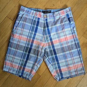 This listing is for two pairs of 100% cotton shorts by U.S. Polo Assn.. One pair has a very light blue and white stripe and the other features red, white and blue plaid. These have a slender fit, with a Tag Size of 28W. Each pair has slit pockets on the front side and slit pockets with buttons on the rear side. These are in excellent used condition! Measures Approximately: 30" waist, 18" outseam, waist to hem, 9" inseam These were originally $18.99 each, asking $15.00 for both.