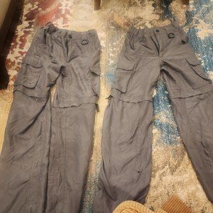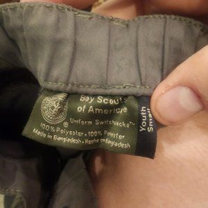 Kids have long outgrown these. This is two pair of worn but completely intact youth uniform boy scout pants. These are long pants from the scouts switchback line which means they are made of quick dry nylon fabircm. They convert with zipper legs into shorts. We bought them for our kids for formal and informal scouting events from backpackign to courts of honor. One pair is youth small, the other is youth medium. The medium pair has wear on the butt and was reinforced and repaired by a local alteration place. The repair is in the photo These come from the scout shop without a hem since kids are all leg lengths. We never had them hemmed and our kids just rolled them up. All the clips and pockets and zippers and snaps work. We found that these pants / shorts are actually quite functional for any hiking whether scouts or not. Smoke free home. Selling them both at one time since no one needs one pair of these and the kids grow.