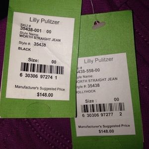 Brand new with tags lilly pulitzer skinny jeans! One pair is purple and the other is black. Bought in the wrong size u fortunately.. but they are gorgeous pants at a great price!!