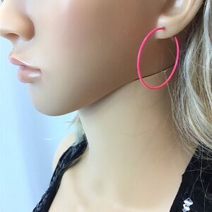 - (1) pair of neon pink hoop earrings. Approx 1.5” wide.