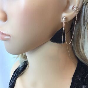 - (1) pair of black feather and gold-tone dangle earrings with one attached chain and cuff. Approx 1.5” long.