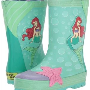 Two pairs of toddler size 8 boots. One pair is Kamik waterproof snow boots, only worn a handful of times. The inside has a Sherpa lining and is very warm and comfortable. Other pair is a pair of Western Chief Disney Princess Ariel rain boots. Both have been worn but still plenty of life left in them to keep your kid warm!!