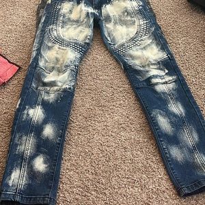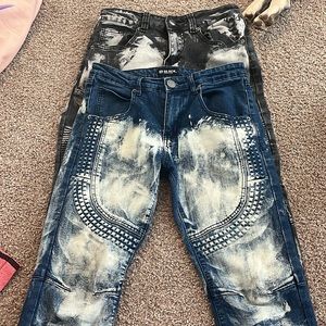 2 pairs of Black premium jeans. Both are distressed with rips. One pair black the other blue.