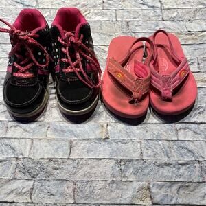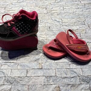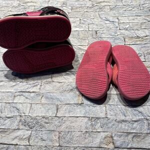 2 pairs-Size 8 toddler girl shoes. 1st pair are Disney Minnie Mouse shoes. 2nd pair are pink Rainbows. There is some peeling as shown in photo but would make great play shoes.
